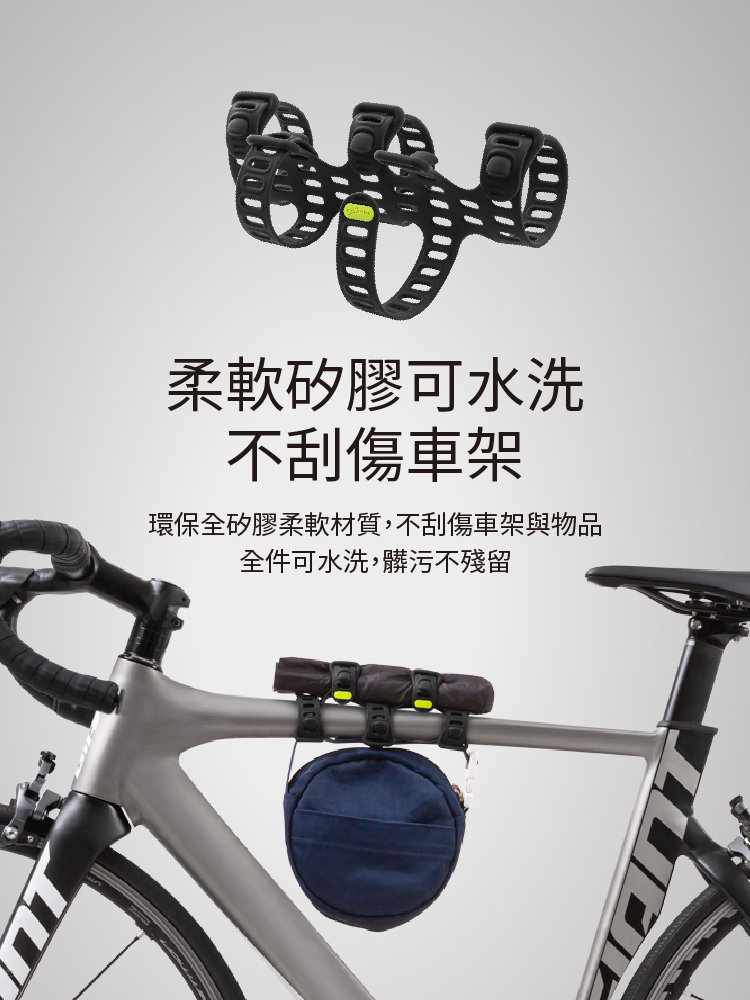 ※環保材質:採用柔軟矽膠,可水洗且不損傷車架與物品